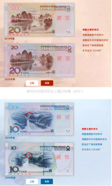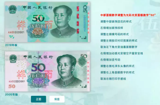 2019年版第五套人民币保持上一版别第五套人民币纸币规格、主图案、主色调、“中国人民银行”行名、国徽、盲文面额标记、汉语拼音行名、民族文字等要素不变。