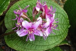 虎颜花属于野牡丹科虎颜花属,多年生常绿草本,茎极短,被红色粗硬毛,具粗短的根状茎,略木质化;叶基生,叶片膜质,心形,顶端近圆形,边缘具细齿,基部心形,长宽20-30厘米或更大,叶面无毛,叶背被红色绒毛。