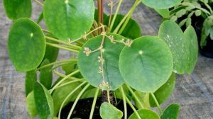 镜面草,别名:翠屏草,拉丁文名:Pilea peperomioides Diels .为荨麻科、冷水花属多年生肉质草本植物。镜面草虽然不是镜子,但那肥厚近圆形的肉质叶,叶柄盾状着生,很象古代仙人照面的镜子,故人们亲切地称它为镜面草。镜面草叶片深绿色,有光泽,叶的中央上方叶柄着生处有一个金黄色的圆点,故人们又称它为"一点金"。从中央向四周有辐射状叶脉,有人又叫它"金线草"。翠绿色的叶片又象圆形的屏风,云南人就普遍称它为"翠屏草"。镜面草较耐寒,喜阴,应在有遮阴条件的地方养护,一般用作盆栽观赏。