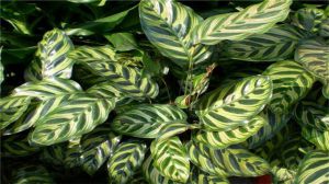孔雀竹芋为多年生常绿草本,因为叶面上有墨绿色与白色相间的羽状花纹,就像孔雀羽毛上的图案,因而得名。它的奇特性在于:叶片白天舒展,晚上闭合。