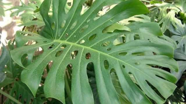仙羽蔓绿绒:叶片宽,叶子肥厚,呈手掌形,有羽状全裂,叶柄很长,呈深绿色,叶面有光泽。