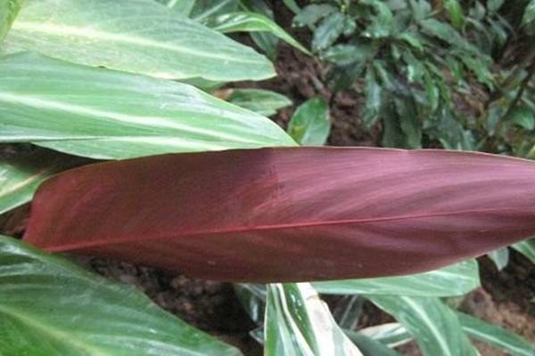 紫背竹芋叶在基部簇生,具短柄,叶片长椭圆形至宽披针形,叶长30厘米至40厘米,宽8厘米至12厘米,叶面深绿色,有光泽,叶背紫褐色。穗状花序,苞片及萼鲜红色,花瓣白色。