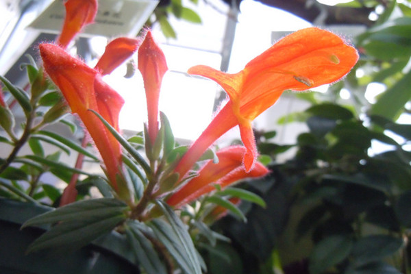 鲸鱼花的花朵具有独特的造型,好像张开的鲨鱼大嘴。单朵开放,花朵腋生,管状花先端开裂。花色有红、黄、橙、粉红或双色。