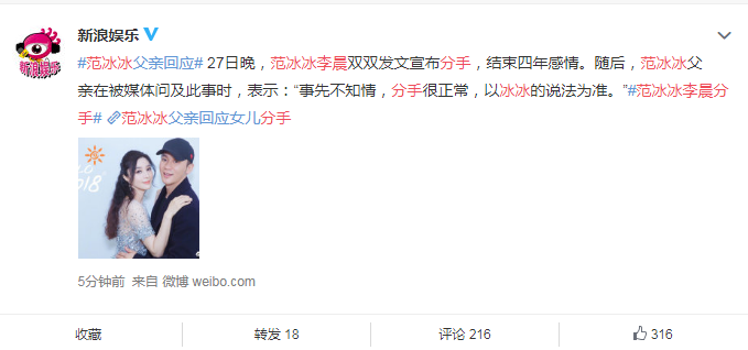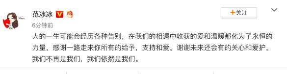 6月27日,范冰冰微博发文:“人的一生可能会经历各种告别,在我们的相遇中收获的爱和温暖都化为了永恒的力量,感谢一路走来你所有的给予,支持和爱。谢谢未来还会有的关心和爱护。我们不再是我们,我们依然是我们。 ”