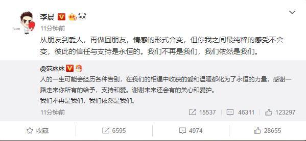 随后李晨回应到:从朋友到爱人,再做回朋友,情感的形式会变,但你我之间最纯粹的感受不会变,彼此的信任与支持是永恒的。我们不再是我们,我们依然是我们。