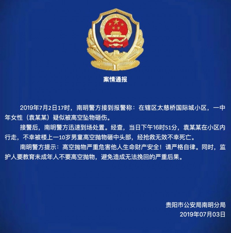 据“贵阳公安南明分局”7月3日通报,2019年7月2日17时,南明警方接到报警称:在辖区太慈桥国际城小区,一中年女性(袁某某)疑似被高空坠物砸伤。