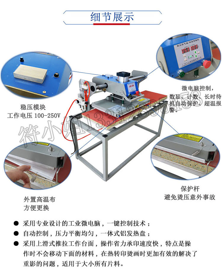 ● 采用上滑式推拉工作台面,操作省力承印速度快,操作时不会移动下面的材料。特别在热转印烫画时有效的解决了重影的问题,适用于大小所有片料。