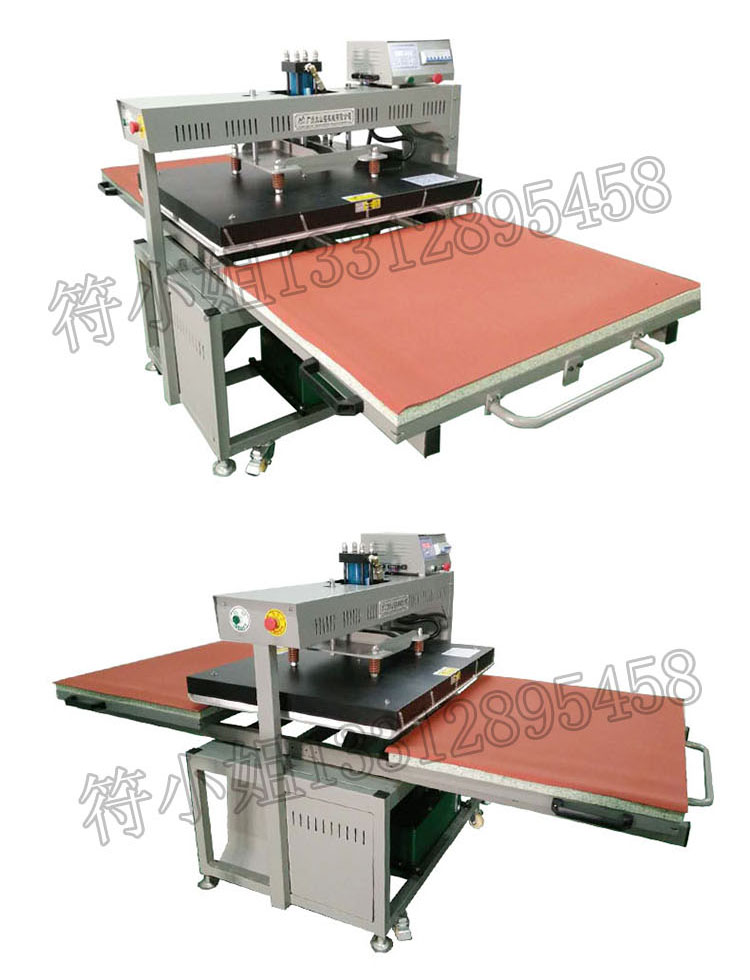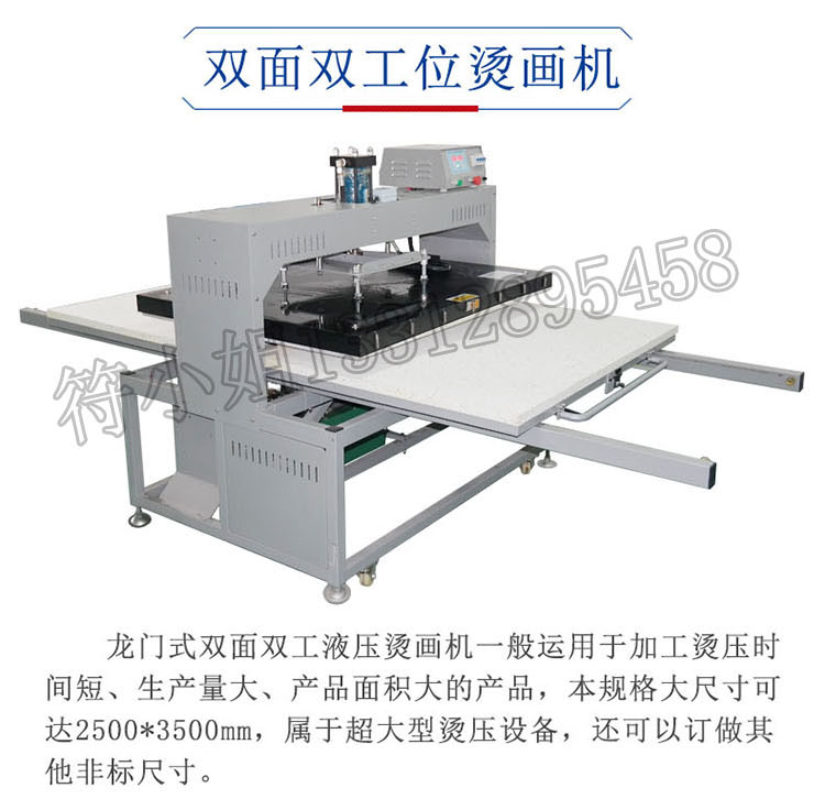 龙门式双面双工液压烫画机一般运用于加工烫压时间短、生产量大、产品面积大的产品,本机器可做大尺寸规格至2500*3500mm,属于超大型烫压设备,还可以订做其他非标尺寸。
