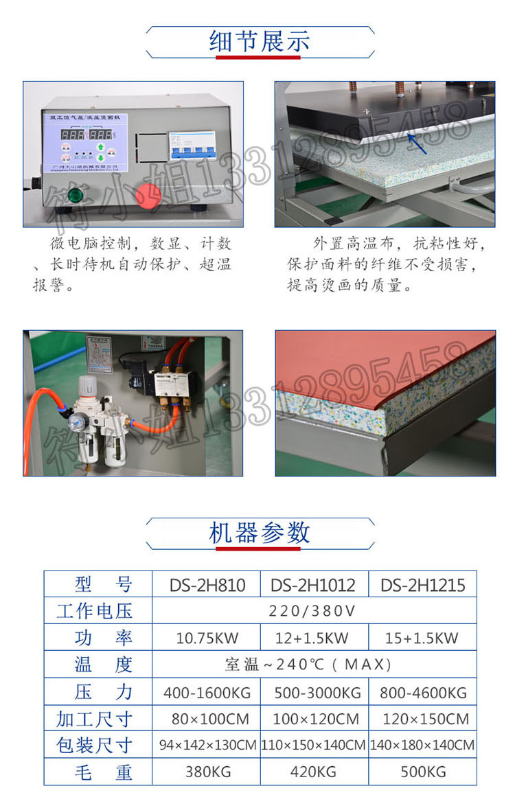 机器采用液压装置,压力大且性能稳定;加热板采用特殊管环绕设计,加热均匀,发热管与发热板注为一体,安全耐用发热均匀,热导性强;可调整压力,操作方便。